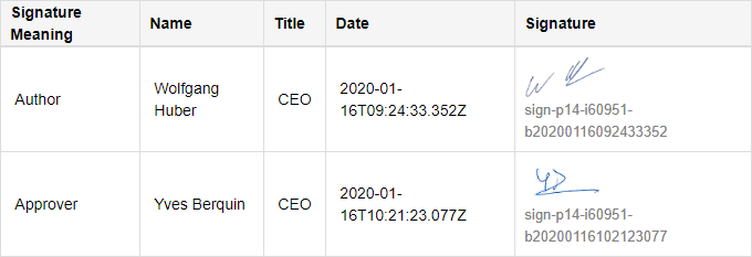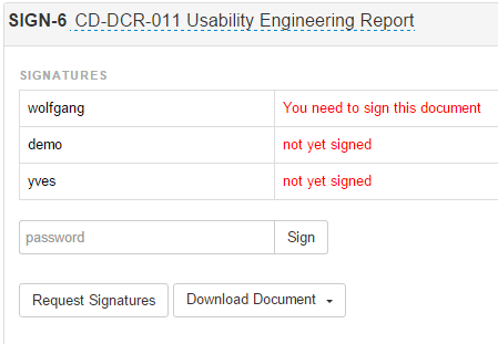 The required signatures are automatic extracted from the controlled document. The signature itself is done by providing a signature password specific to the user who needs to sign. It can be configured to be the same or different to the login password.