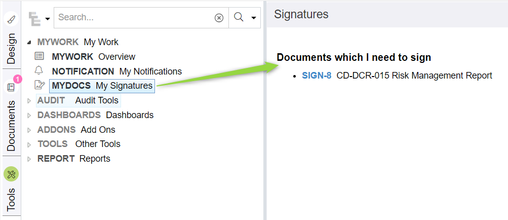 To quickly see the Documents are waiting for your signature, you can always click on "MYDOCS" under the MYWORK section of the Tools tab: